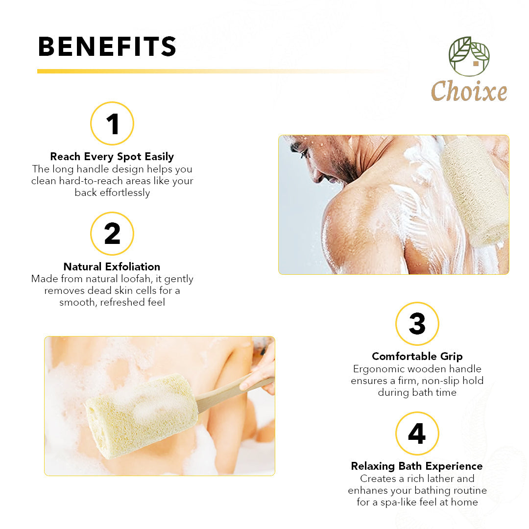 - All-natural, eco-friendly, zero-waste loofah with a long handler can be used for bathing or showering, body scrubbing removal, and leaving skin soft and smooth.